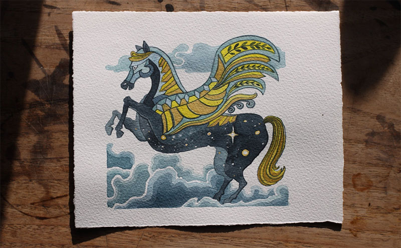 The paintings are hand-made by Ana, using the technique of watercolor on paper. Its dimensions are 12.5 cm by 13 cm, except one that is 12 by 13 cm. Learn more about the artist.